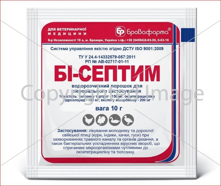 Антибиотик для лечение молодняка и взрослой домашней птицы (куры-бройлеры, ремонтный молодняк, индейки, утки, гуси) при заболеваниях ЖКТ и органов дыхания, бактериальных осложнениях, вирусных инфекциях, которые вызваны микроорганизмами, чувствительными к окситетрациклину и тилозину. Пакет 10 г.