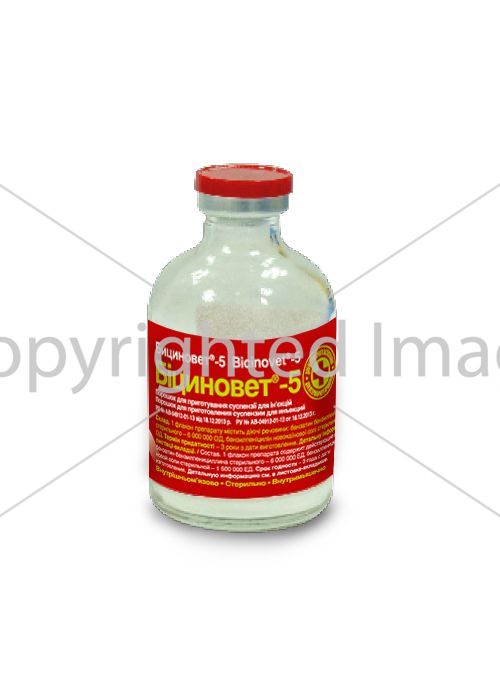 Фармакологические свойства. Бициновет-5 является бактерицидным антибиотиком, который относится к группе пенициллинов пролонгированного действия, которые чувствительны к действию β-лактамаз. Препарат тормозит образование пептидных связей за счет ингибирования транспептидазы, нарушает поздние этапы синтеза пептидогликана клеточной оболочки, что приводит к лизису микробных клеток, которые делятся.