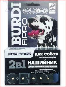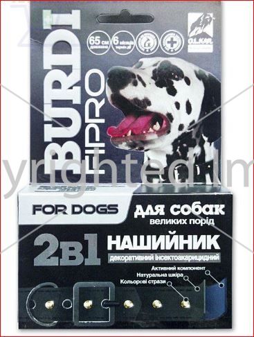 Ошейник декоративный инсекто-акарицидный для собак крупных пород "Бурди Фипро" 2 в 1, 65 см, с украшениями, содержит активный компонент фипронил, изготовлен из натуральной кожи, срок активного действия и использования - до 6 месяцов. Ошейник украшен цветными стразами.