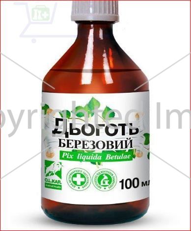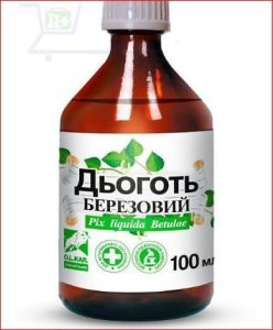 Деготь берёзовый, флакон 100 мл. Применяется внутрь как антисептическое и противобродильное средство при атонии и тимпании рубца, хроническом катаре желудка. Как отхаркивающее и антисептическое средство при заболеваниях дыхательных путей делают ингаляцию паров дегтя. Наружно деготь применяют при хронических кожных заболеваниях, в том числе при ранах конечностей, язвах, мокнущих дерматитах, панариции, для лечения чесотки и стригущего лишая. Как кератопластическое средство дегтярную мазь (5%) назначают для ускорения заживления трещин копыт лошадей и рогового башмака рогатого скота. В чистом виде деготь используют для обеззараживания кожной збруи. Применяют в виде мазей, паст, линиментов, эмульсий.