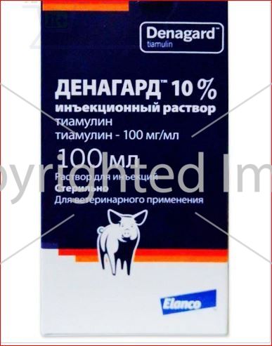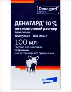 Денагард 10% инъекционный раствор – антибактериальный препарат, содержащий в качестве действующего вещества в 1 мл раствора 100 мг тиамулина основания и вспомогательные вещества: сезамовое масло, пропил галат, глицерил моноолеат, этанол.