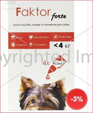 Faktor forte капли от блох, клещей и гельминтов для собак до 4 кг, 4 пипетки по 0,5 мл. Защита животного от паразитов до 4 недель.