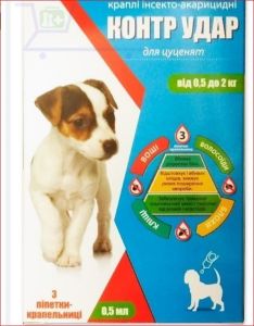 "Контр Удар" № 3 капли на холку инсекто-акарицидные для щенков весом от 0,5 до 2 кг, 3 пипетки-капельницы по 0,5 мл. Предназначены для защиты собак от эктопаразитов, эффективен также при ушной чесотке (отодектозе).