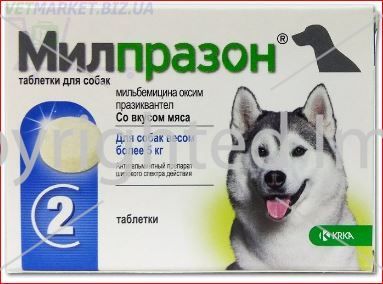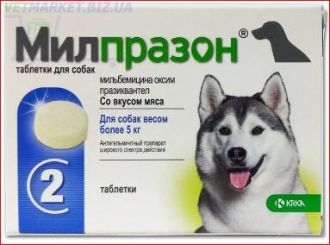 Милпразон® таблетки для собак более 5 кг - препарат для лечения и профилактики при нематодозах, цестодозах и ассоциативных нематодо-цестодозных инвазиях, вызванных гельминтами следующих видов: цестоды - Dipylidium caninum, Taenia spp., Echinococcus spp., Mesocestoides spp.; нематоды - Ancylostoma caninum, Toxocara canis, Toxascaris leonina, Trichuris vulpis, Thelazia callipaeda; Angiostrongylus vasorum (снижает интенсивность заражения), Crenosoma vulpis (снижает интенсивность заражения), Dirofilaria immitis (профилактика заболевания).
