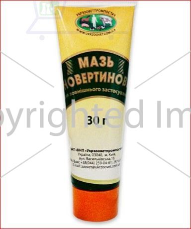 Мазь Новертиновая, 30 г - применяют собакам, кошкам, кроликам, пушным зверям при лечении блох, вшей, власоедов и поражении арахно-энтомозами: псороптоз, отодектоз, нотоэдроз, саркоптоз, демодекоз.