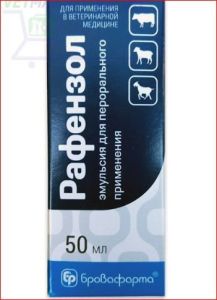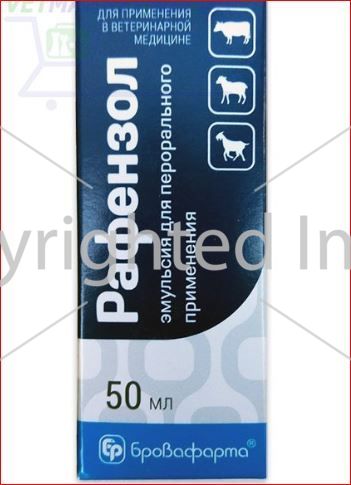Рафензол эмульсия для перорального применения, 50 мл - препарат для дегельминтизации крупного рогатого скота, овец и коз при трематодозах (парамфистоматидозы, дикроцелиоз, фасциоллез) и нематодозах кишечного тракта и легких.