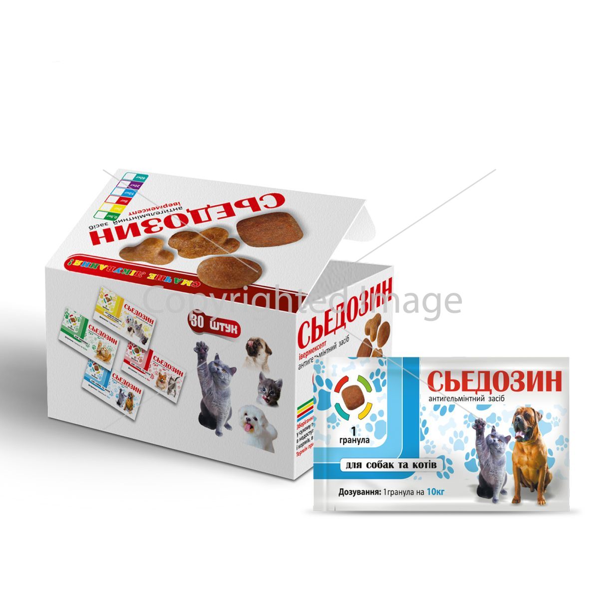Антигельминтное средство в виде вкусной и ароматной кормовой гранулы с ивермексептом для котов и собак.