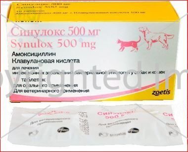 - при весе животного 19-25 кг — 0,5 таблетки синулокса 500 мг,