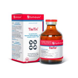 Тим Тил раствор для инъекций, 10 мл - антибиотик широкого спектра действия для лечения у крупного рогатого скота, овец, коз, свиней заболеваний: дизентерия, илеит, коллибактериоз, сальмонеллез, атрофический ринит, бронхопневмония, перитонит, гнойный артрит, бруцеллез и другие инфекции, вызванные микроорганизмами чувствительными к тиамулину и тилозину.