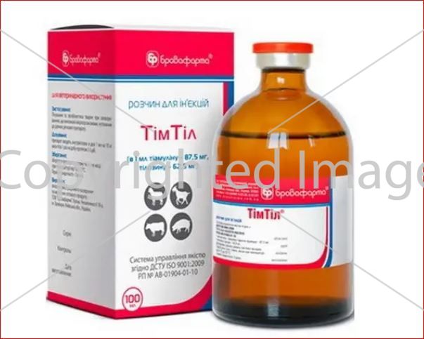 Тим Тил раствор для инъекций, 10 мл - антибиотик широкого спектра действия для лечения у крупного рогатого скота, овец, коз, свиней заболеваний: дизентерия, илеит, коллибактериоз, сальмонеллез, атрофический ринит, бронхопневмония, перитонит, гнойный артрит, бруцеллез и другие инфекции, вызванные микроорганизмами чувствительными к тиамулину и тилозину.