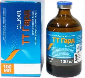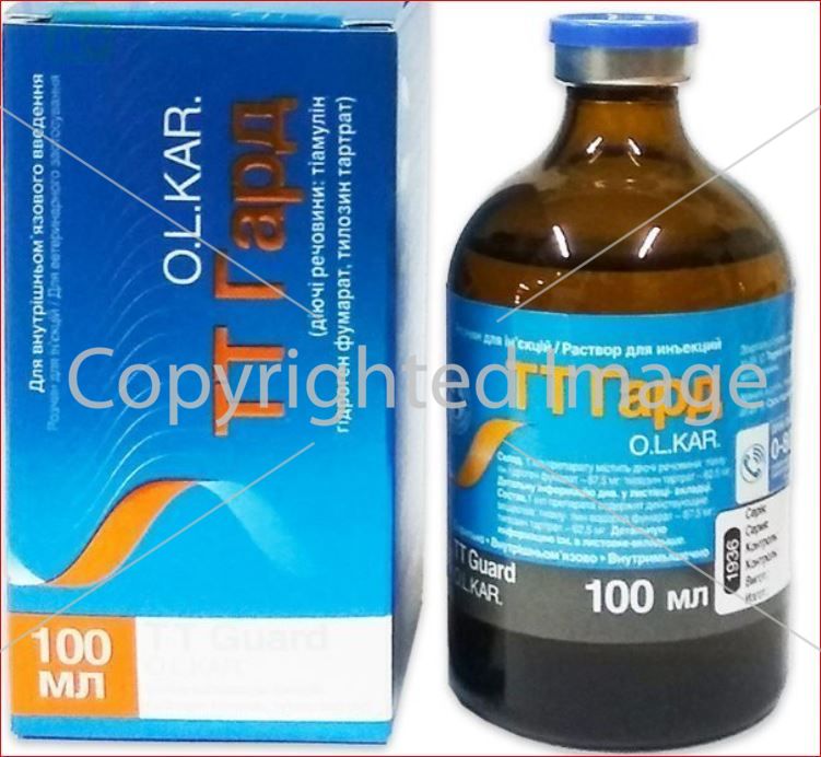 ТТ Гард, раствор для инъекций, 100 мл. Применяется для лечения животных - крупного рогатого скота, свиней, овец и коз больных бронхопневмонией, дизентерией, перитонитом, метритом, пупочным сепсисом, гнойным артритом, копытных гнилей, бруцеллезом, лептоспирозом, послеродовыми осложнениями и хирургическими инфекциями, вызванных микроорганизмами, чувствительными к тиамулину и тилозину.